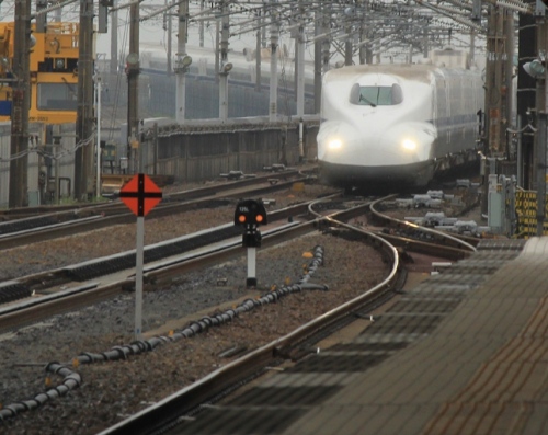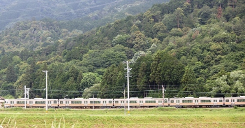 東海道下り線 踏切の遮断機が下りて、カンカンカンカンと鳴り出しました貨物かな?しらさぎ号はまだ時間があるしと待っていたら・・・・・・・えっ?え?ここはーーー特急か貨物しか走らないはずの下り線313系が下っていきました。びっくりです。試運転でした。まーさんが「117系がまた少なくなるナ」とつぶやいてました。そうゆうことになりますね・・・・・・・その後定刻にしらさぎ号がやってきて新緑の木々の間に消えていきましたそして不思議と行ってしまう近江長岡へと