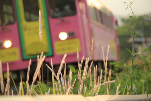 木知原駅線路際にはえている白い穂に (チガヤ?)夕日が反射して綺麗だった