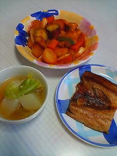 今日は、午後から公園を1時間程お散歩しました☆ もちろん、少し早歩きで 今日はね!!手を胸の下で指先だけを組んで 気持ち。ウエストをひねるように歩いてみたよ 昨日とは大違いの天気で気持ちよかったです♪ で・・・帰ってきてから夕飯の準備☆ 今終了したところです 今日は、じゃがいも(北あかり)+にんじん+サツマイモ を先に油でサッと炒めお芋の3/2位の水を入れ 茹でます。竹串がささったら残ってるお水を捨て あとは、マーボーナスの素で炒めました 簡単ですよ☆~。ピリ辛です。 あとは、蕪とキャベツのコンソメスープ☆ ホッケの焼き魚です☆^o^☆ あとは、きゅうりの漬物でいただきます