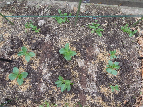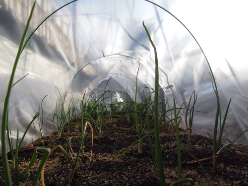 陽当たりの良くないアトリエ農園の北エリア。以前、アトリエにとまった早朝に、このスペースに東からの光が差し込むことをはじめて知った。 ここでは、野菜を育てるのは無理かと思っていたが、土が肥えてくるにしたがって、野菜の育ちが良くなってきた。 しかし、冬には強く北風が吹き込むので、昨年からフェンスにビニールをはって防風している。 こんなに寒いのに移植したネギが動き出している。 キャベツに水菜にスティックセニョール。ゆっくりとではあるが、大きくなってきた。 ホウレンソウも発芽しているが、種をこぼしたときに紛れ込んだ丸い葉の双葉も見える。 野菜の周りには、バーク堆肥、くん炭、油かす、天恵緑汁の残滓などが投入している。