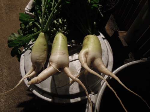 赤白の二十日ダイコン。これが二鉢。 スクナカボチャの周りにはカキチシャ。ダンゴムシにたべられるので、ポットで避難させている青梗菜も短期の仮置き。 培養土の底に穴をあけて、枝豆をまいた。これが4袋。 スナップエンドウの後に、種から育ったポンテローザと世界一トマト。5株しか植えられなかったので、奥に6株追加。手前にニラを移植。 間引いたフダンソウを間に植えた。手前のトマトと奥のトマトとの間にもちょっとミスマッチな何かを植えてしまった。 ここは、ツタンカーメンの撤収後、開墾し直した畝。畝を作るために掘り返したら地層が深かったのは真ん中だけで、ふちの方はすぐにカチカチの岩盤だった。今まで、そこそこ野菜が育っていたので、まさかこんなひどい状態だとは予想できなかった。 まいていないのに生えてきた野菜。左はカボチャのようだが、右は何だろう、草かな? 残りのゴボウ、二袋を収穫。前回の収穫時よりも倍くらいの太さに育っていた。 納得の太さ! 最後にイチゴも収穫した。過去、最大量の収穫。おおきなイチゴが実ったのは四季なりイチゴ。とよのか、は肥料不足か、小さい。そのうえ、ダンゴムシやナメクジに食い荒らされていた。一番、よわい株は、成ったイチゴすべてが、食べられてしまうので、おもいきって撤収した。