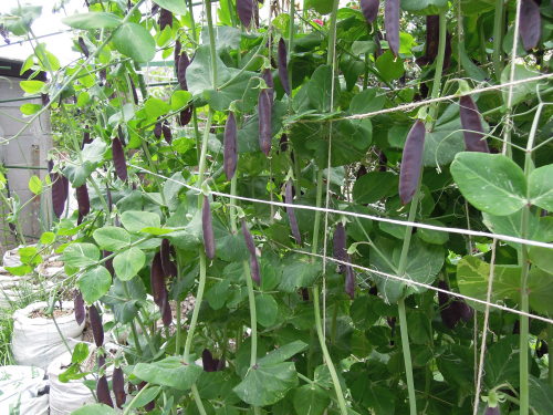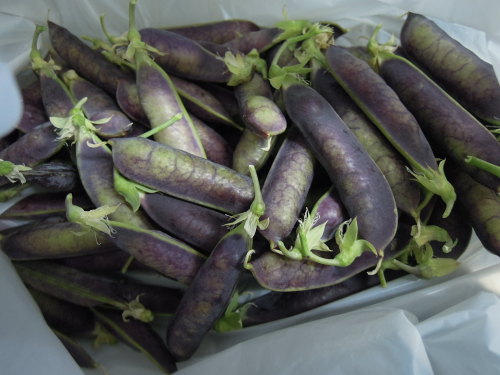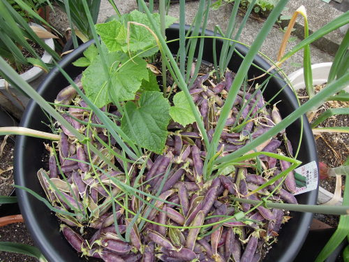たくさん発芽した大根をロマネスコの畝脇に移植しておいたもの。よく耕していなかったので、歩くダイコン。 イタリアのナス、デガンディアの苗も追加。 米ナスのくろわしは、晩生タマネギの中に植えたので、スペース確保のためまわりのタマネギを葉タマネギとして収穫。 種からまいたトマト、世界一とポンテローザ。少しだけ大きくなった。 ラディッシュ収穫。 甘いエンドウ(スナップ)がたくさん収穫できた。 塩茹して食べた。ますます甘みが乗ってきた。