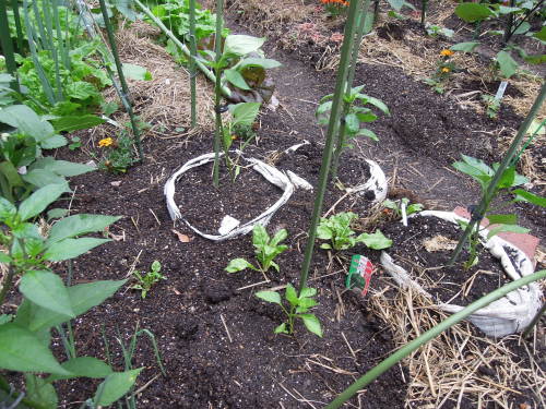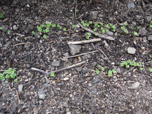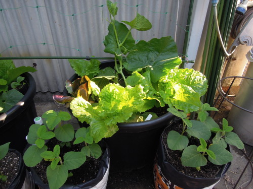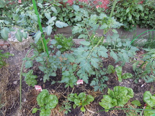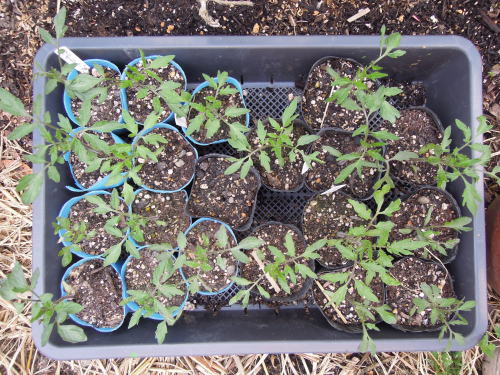 ネギ坊主からとった種を植木鉢にばらまいておいたら大小いろいろなネギ苗ができた。それをキュウリのコンパニオンプランツとして使った。 この植木鉢は、ツタンカーメンのサヤ・マルチ。 植木鉢のレタスとトマトの寄せ植えも元気に育っている。岡山サラダ菜と千果。 フルーツトマトとサンチュなど。 ゴーヤの苗床にしていたこの植木鉢からもジャガイモが生えてきた。 トマトの脇芽を挿し木してみた。5年くらい前のコスモスの種がでてきたので、ダメ元でばらまいた。 植えるところがなくて植木鉢に埋めたジャンボニンニクにも芽が出てきた。