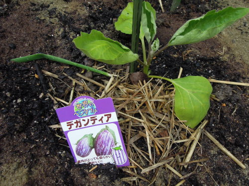 アトリエ農園に今年、定植したナスの品種もまとめてみた。 デガンディア。これが一番、おしゃれなナス。 米ナスのくろわし。 京都の伝統野菜、加茂ナス。 ポピュラーな千両二号。 長ナスの黒陽。 ところが、この黒陽が何者かに茎を切られた。 急遽、別の長ナスに入れ替えることにした。買ってきたのは庄屋大長茄子。 しかし、黒陽を撤去するのは忍びなく、復活を期待してそのまま育てることにした。 庄屋大長茄子は別の場所に定植した。 この場所、畝を作ったらネコがやってきてすぐに掘り返してしまう場所なので、マルチ抑えを定植した苗のまわりに立てておいた。 というわけで、今年のナスは、6種類、6株となった。