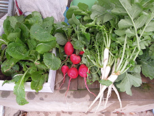 週末、岡山でいくつかの展覧会を見て、家内の実家のぶどう園に一泊した。 写真は、義理のお母さんの家庭菜園の野菜。左は、苗床から貰ってきた白菜の苗。母が今からでも白菜ができるかもしれないというので、持ってかえってアトリエ農園にも定植することにした。 真ん中がラディッシュだが、私の育てるラディッシュの4倍くらいの大きさ。食べてみると柔らかくおいしかった。 右が、葉ダイコン。 母が軽く草取り中。このあと、白菜苗を定植したらしい。最近は、苗や種の買い出しは兄の仕事になっているようだが、やはり定植や種まきは母が師匠だ。
