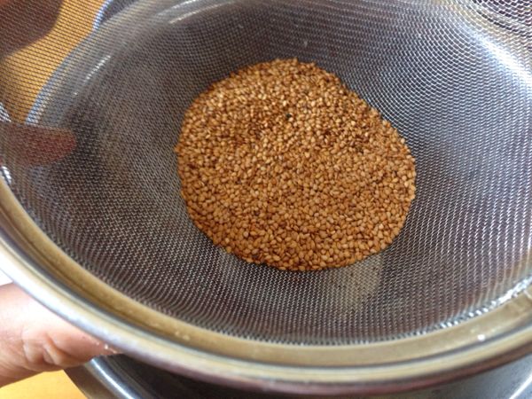 風で大きなゴミを飛ばしたあと、ヤカンの網で小さなゴミを取り除きました。 黒い未熟な種などが落ちました。 洗い胡麻というのがあるので、洗うことにしました。浮かんだ胡麻やゴミを取り除きました。 お箸で残ったゴミを取り除きました。 キッチンペーパーの上にひろげて、乾燥させます。 乾いた胡麻は容器に集めました。