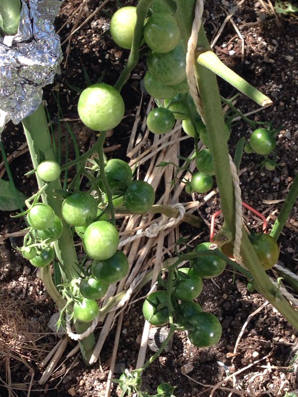 写真だけ見ていると初夏のようなトマト。茎を再接地させて根を出させたものや挿し木から大きくなったトマトですか、たくさん実をつけています。トマトの間のブロッコリーもゆっくり大きくなっています。芽キャベツも葉の数を増やしています。