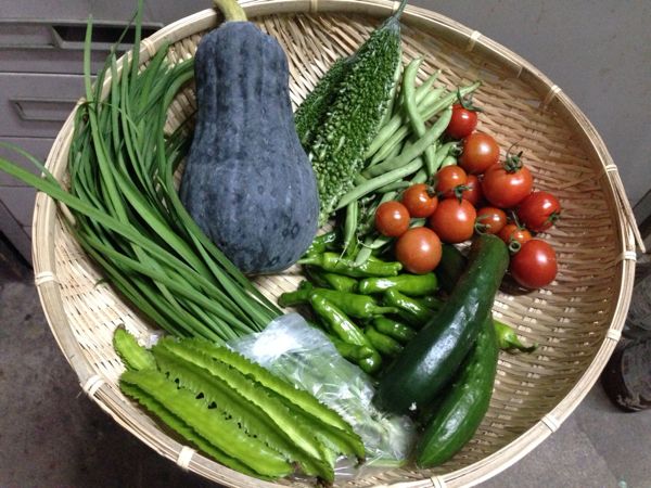 10月22日の夜に収穫した野菜の写真です。カボチャ、ゴーヤ、ミニトマト、キュウリ、インゲン、シカクマメ、シシトウ、ニラ、そして、写真にはありませんが生姜。キュウリの収穫がここまで続いているのは、自己記録の更新です。カボチャは、縦にすっと立ちます。ミニトマトと中玉トマト。夏のシーズンよりも甘いトマトになっていました。そして、ゴーヤ2本。ゴーヤは葉が枯れはじめています。