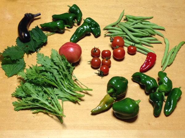 アトリエの菜園、本日の収穫。大玉トマト、ミニトマト、ピーマン、インゲン、茄子、春菊、大葉。少し近づいて撮影。奇蹟のインゲン!貴重な茄子。・・・雨で割れていますが、大玉トマトが赤くなりました。