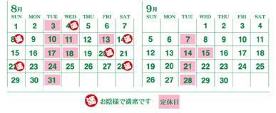 8月、9月の定休日と収穫祭のご案内です。おかげさまで満席の日もでてきました。お早目のお予約をお待ちしております。 詳しくは、できたてのチラシをごらんください