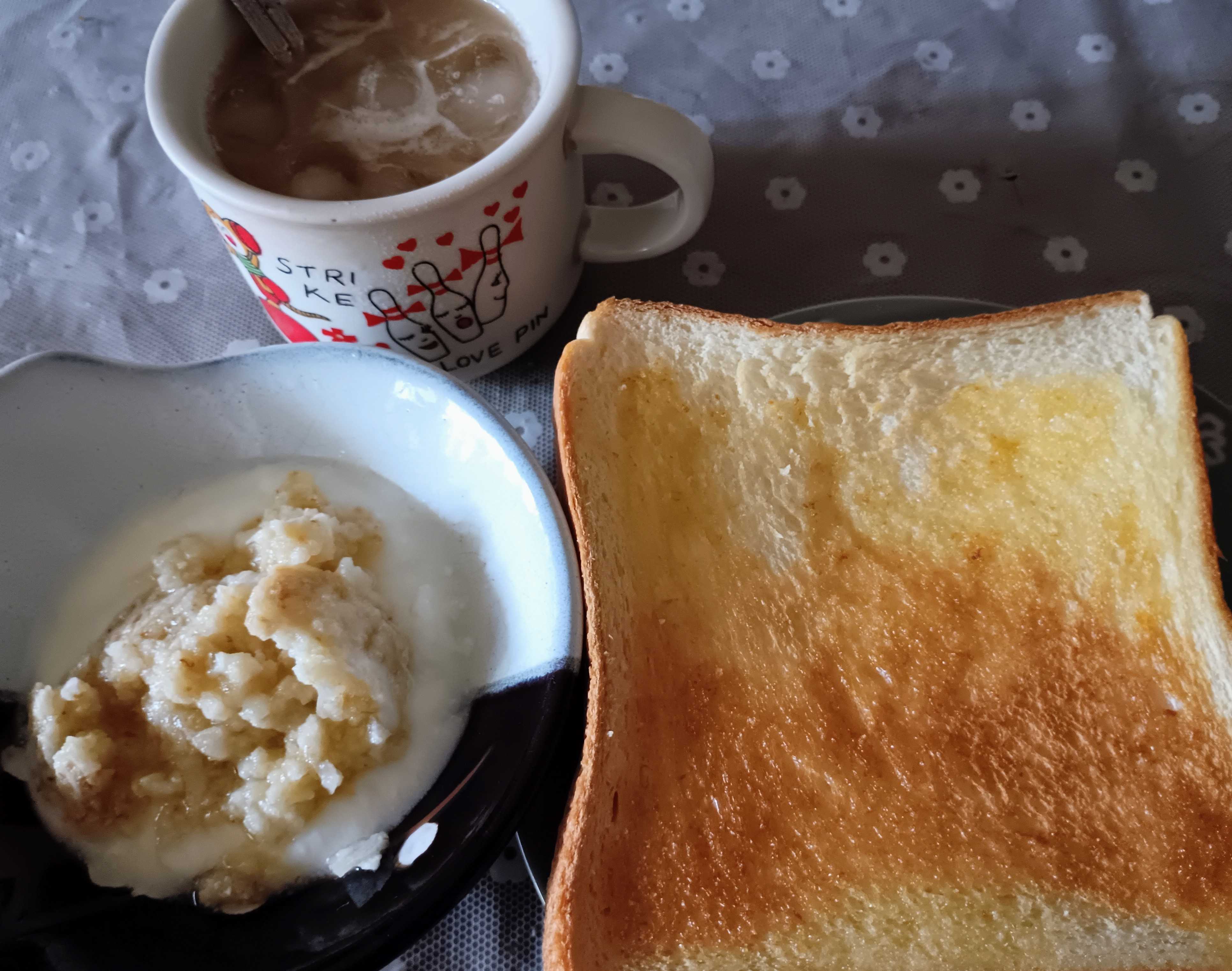 今日は朝からじりじりと暑くて、空もまぶしいくらい晴れてた☀️ 朝ごはんはトースト。私はアイスカフェオレ、ゆうちゃんはホット。バナナ入り腸活ヨーグルトには黒ごまきな粉と砕いたくるみをトッピング✨ 食べ終わったら、なんだかお腹がパンパン。暑さに負けて朝からクーラーON。一日一捨て、簡単そうで地味にしんどい。いつから始めたんだっけ?続いてる方だと思うけど、最近はちょっと息切れ気味。少し休んで、気持ちを入れ替えたほうがいいかも🌿お昼は久しぶりにお好み焼き!…だったけど、市販の粉でちょっと失敗。ゆうちゃんが混ぜると、なぜか粘りが出てキャベツと馴染まずムラができることがある。不思議でも味はちゃんと美味しかったからOK!朝から胃が重たくて、午後のおやつはヨーグルトにチョコレート効果をちょこっと。夕方はいつもの半身浴でじんわり汗を流してリセット🛁夜ごはんは赤飯、じゃが芋と白菜のなめたけ煮、鮭のほぐし身、ニラ入り納豆。ちょっと野菜が足りなかったな…そして今夜も、二人で蜂蜜をスプーン一杯。これが一日の締めくくり🍯