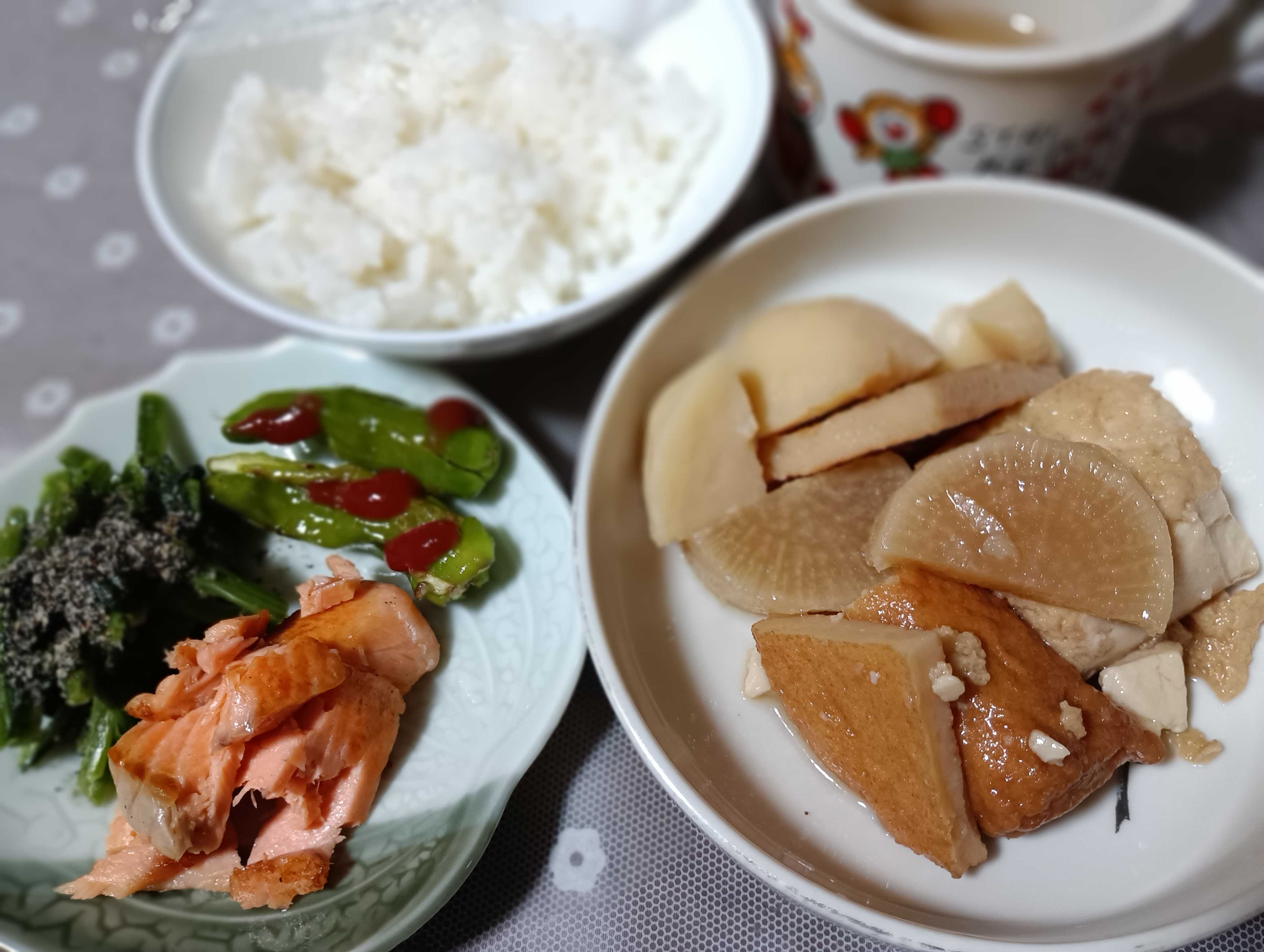 夕飯は、鮭のほぐし身、ほうれん草のお浸し、冷やしおでん。