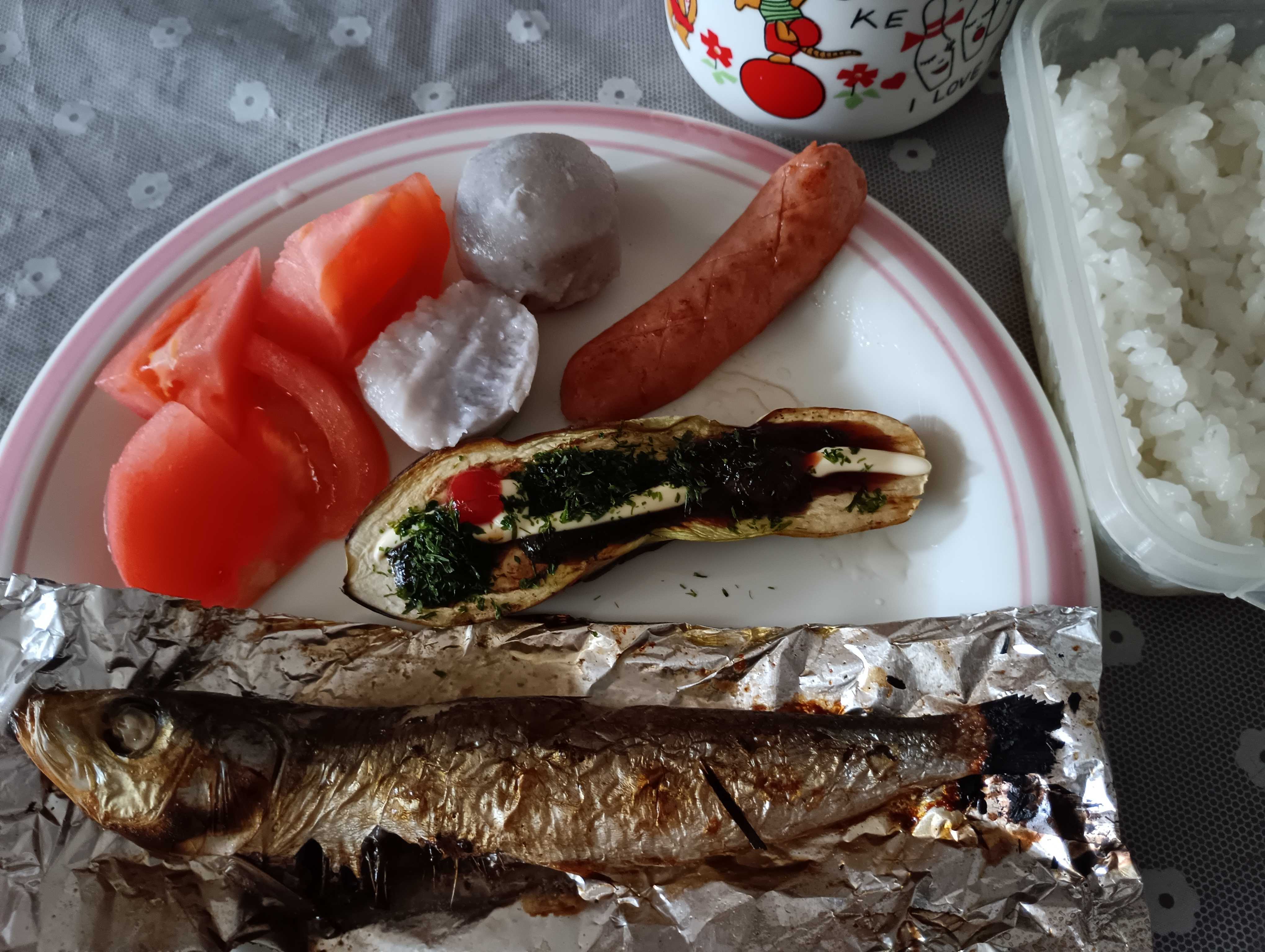 ランチはイワシの若干し、小芋の煮物、茄子のフライパン焼き🍆