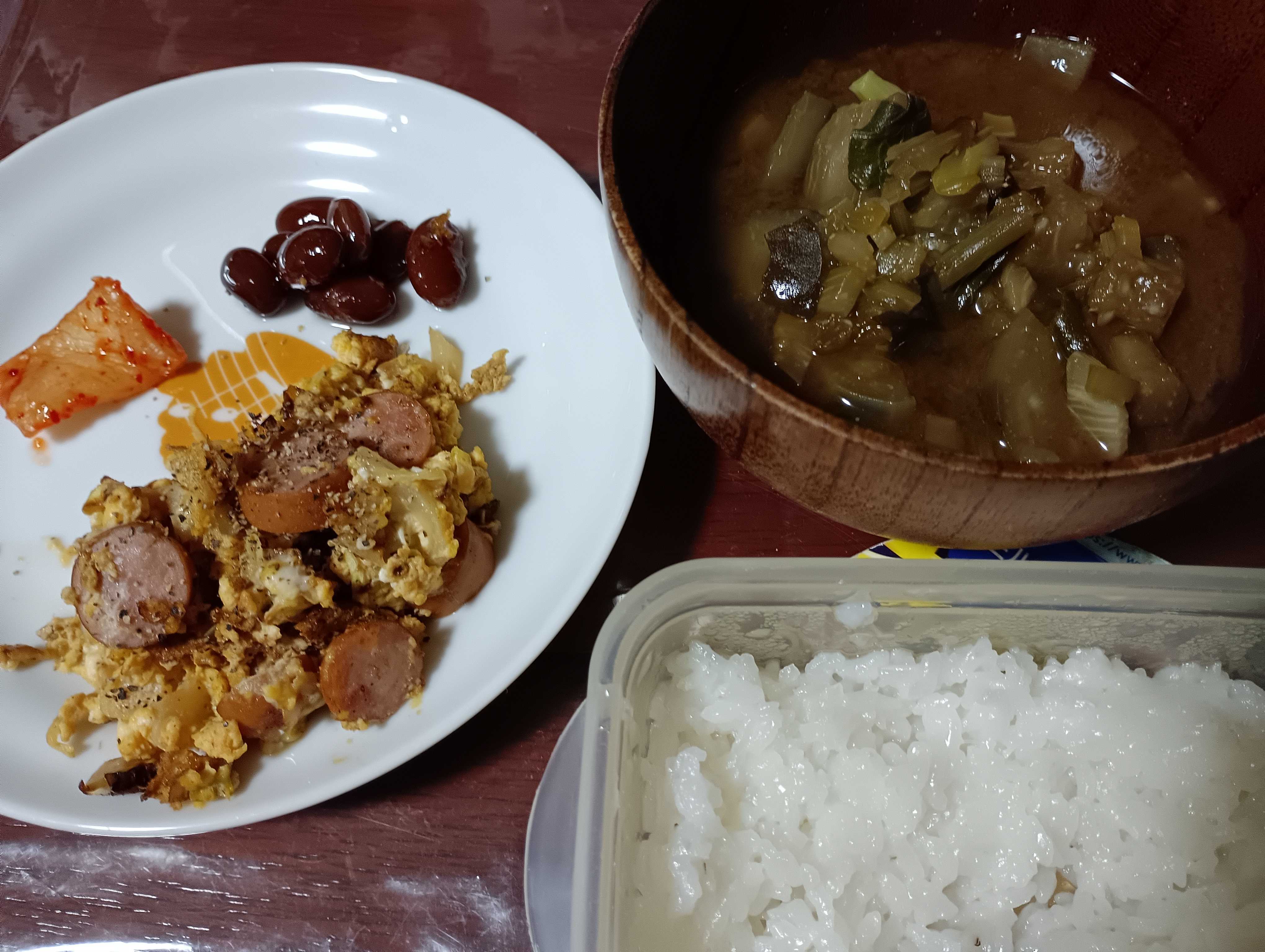 夕飯はソーセージとキャベツの卵炒め、ナスと小松菜の味噌汁🥬