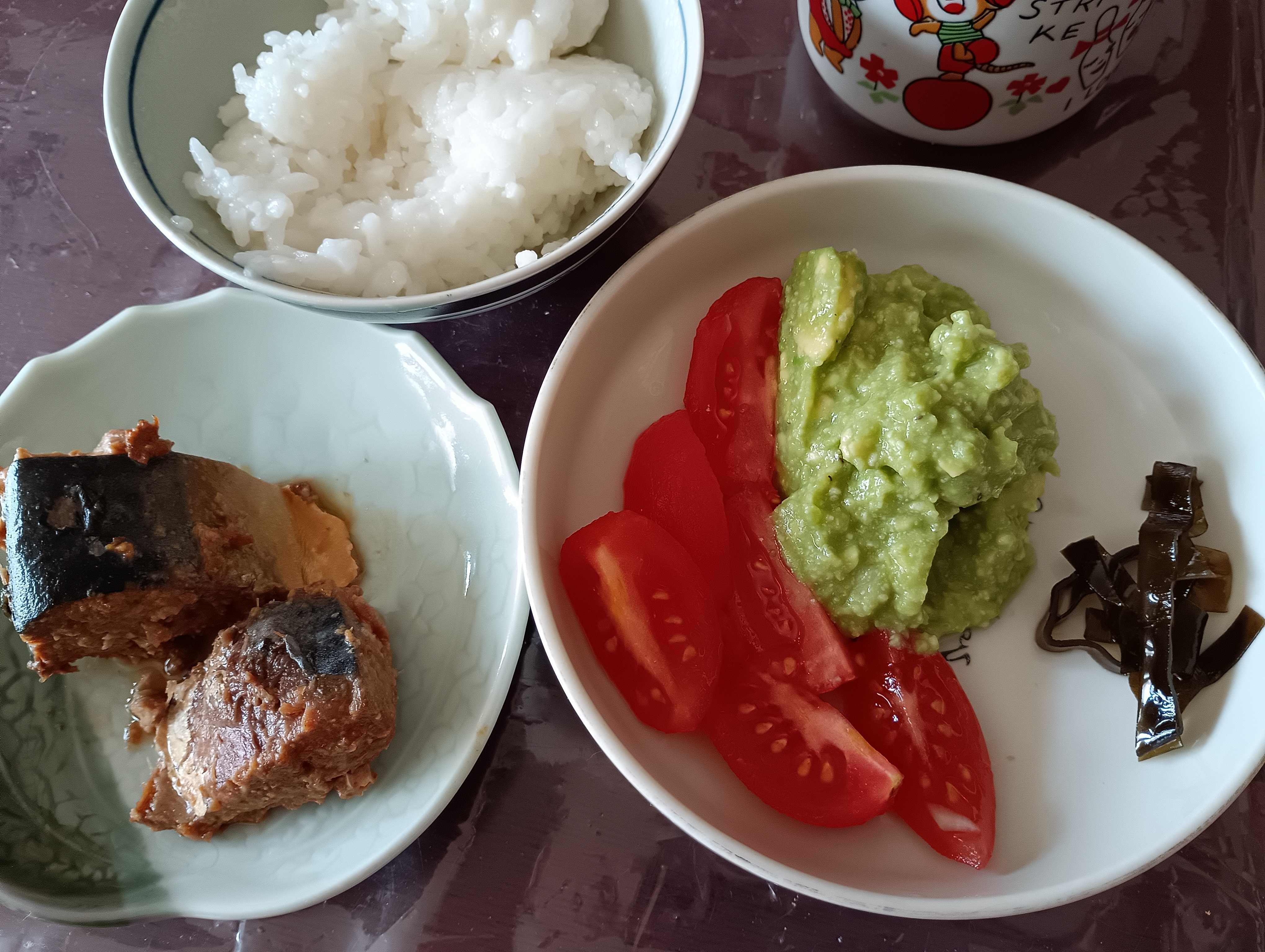 メニューは久しぶりのサバの味噌煮缶にアボカドサラダ。