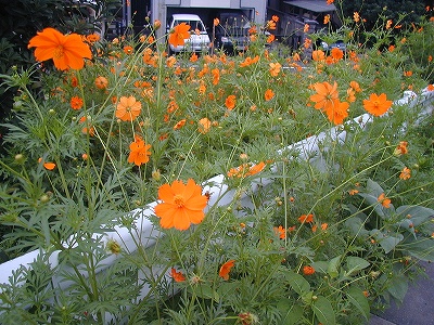 道ばたにキバナコスモスの花が咲いていたので紹介します。 本家のコスモスよりも花の時期が早いのですね。メキシコ原産で花の形もバリエーションが豊富です。 花言葉は、「幼い恋心」なんですよ。 黄色と言うよりもオレンジ色に近いんですね。再確認しました。