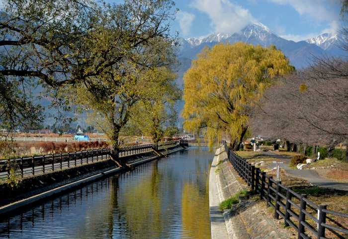 江戸時代に作られた総延長15キロメートルの「拾ヶ堰」1キロメートル進んで30センチメートル余り下がるわずかな高低差のため、水はゆったりと静かに流れます川は途中まで山の方向へ流れて行きます今年の秋は曇りの日が多く、時々姿を現す常念岳も翌日には雲の中に隠れてしまいますカルガモたち近づくと逃げて行きます川のほとりに咲くコスモス(自転車広場にて)華やかに咲いているコスモス畑ではありませんが毎年このお花畑に来るとピンクのコスモスがそっと咲いています。