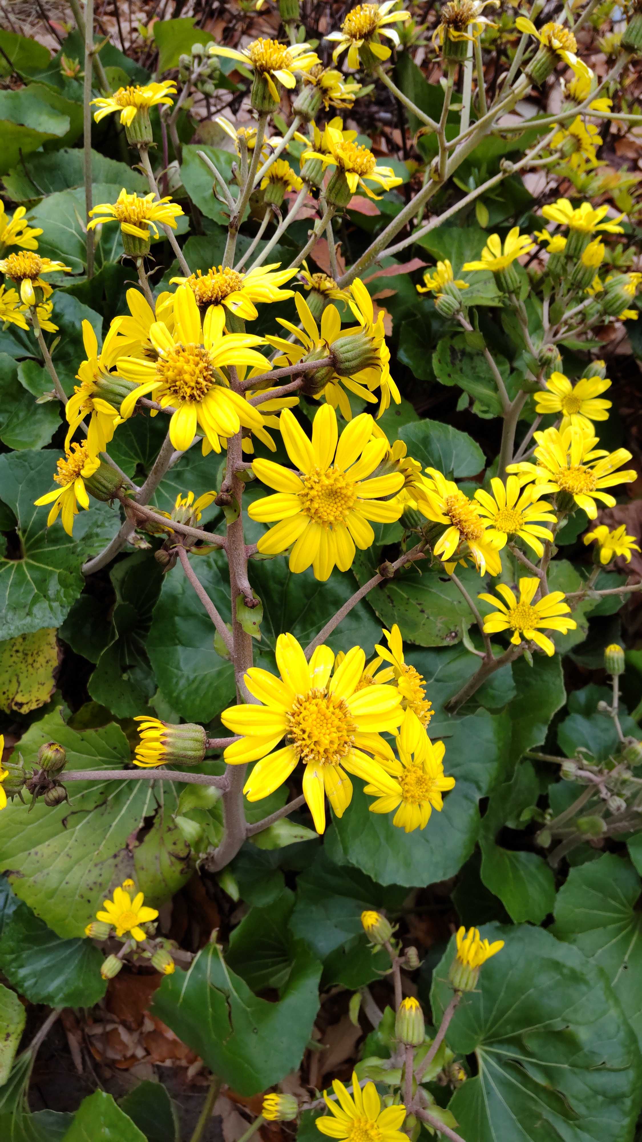 こちら近所のショッピングモールの駐輪所脇に咲いていたツワブキの花。