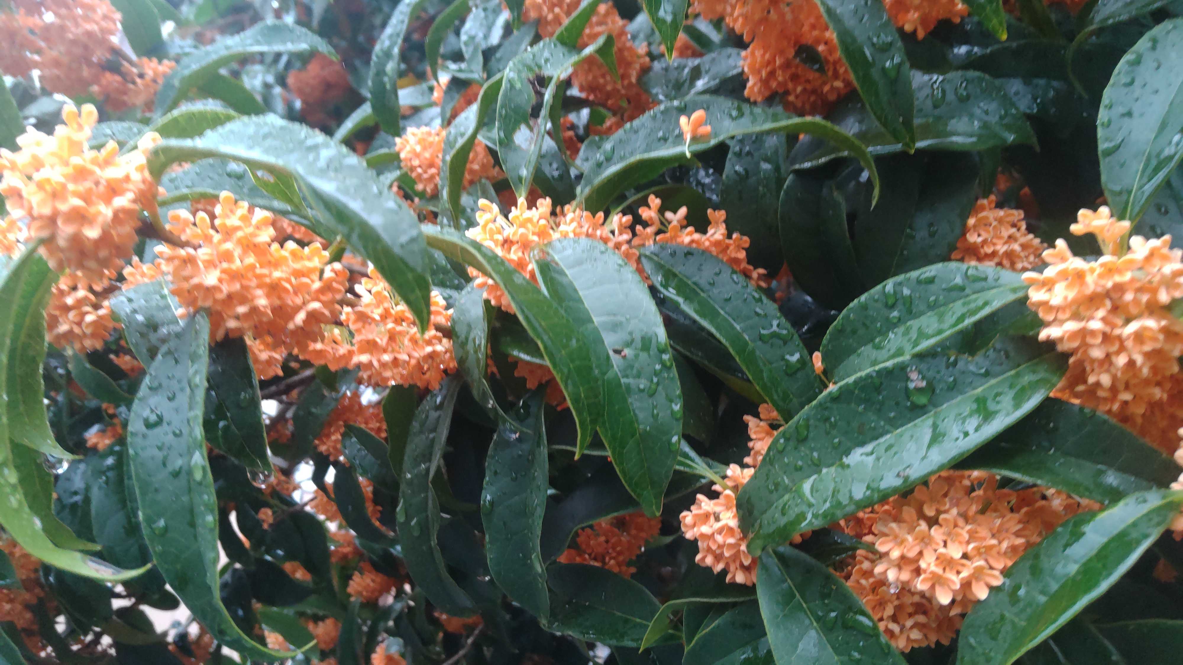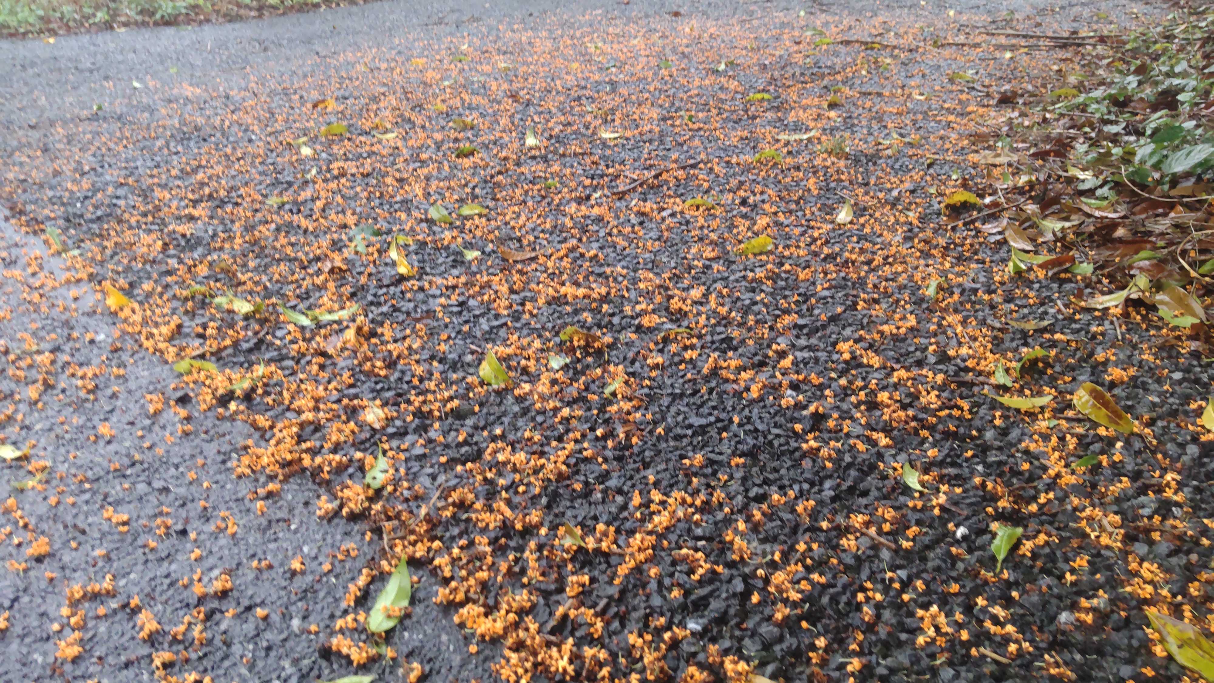 写真は金木犀ですが、満開の状態から雨で散ってきています。