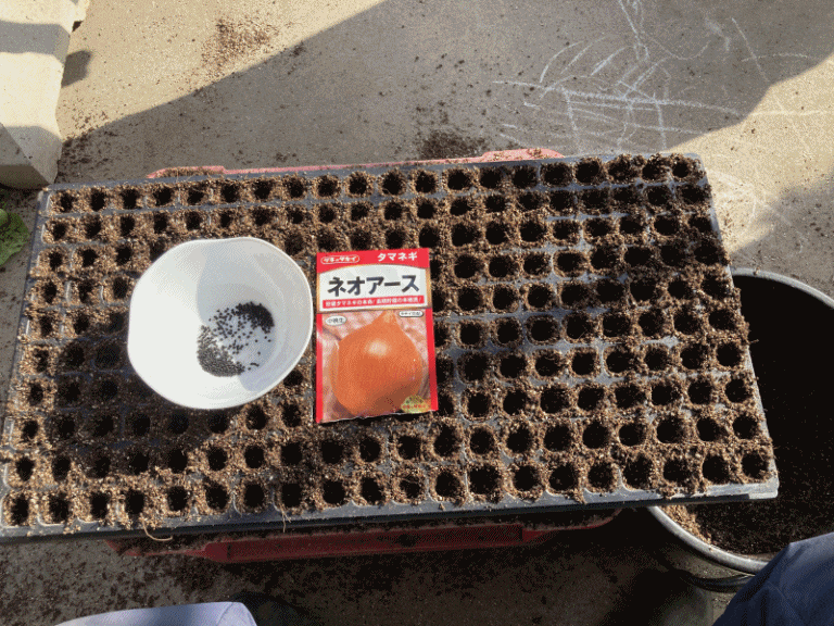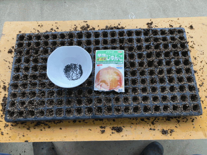200穴のセルトレイに種まき培土を詰めて穴を開け、玉ねぎの種を1粒づつ穴に落とし込み、覆土