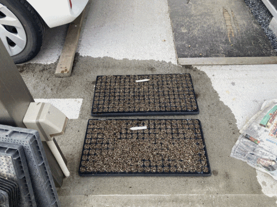 種まきが済んだ後は、セルトレイを駐車場の日陰に移動して、セルトレイの上に新聞紙をかぶせて
