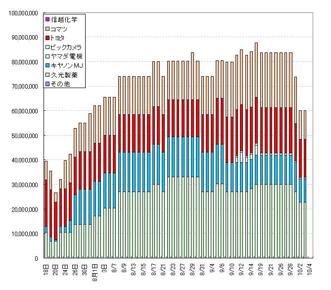 今日の株価は少し戻しましたが、少し懸念材料が多くなってきました。原油価格は90ドルの大台目前インド市場は引けにかけて急落中国共産党大会終了後には引き締め策への懸念米国サブプライム問題の実体経済への影響がちらほら需給でも、米ミューチュアルファンドの決算月で売られているという話ですが、特にトヨタは悪いニュースの発表と合わせて軟調な展開が続いています。裁定買い残高も積み上がって4兆円を超えてきました。裁定買い残は9/11日が底値で日経平均の上昇と歩調を合わせて上昇してきました。買い残高の増加局面は株価も上昇するのですが、残高が高水準になると売り圧力に変わる懸念もあります。要注意です。実力以上の保有額は精神的に負担です。少しポジションを落とすべきか迷ってます。トヨタ 2500株久光製薬 6000株コマツ 4000株キヤノンMJ 4000株住友商事 4000株合計、73,050千円(簿価)損益累計 5,051千円