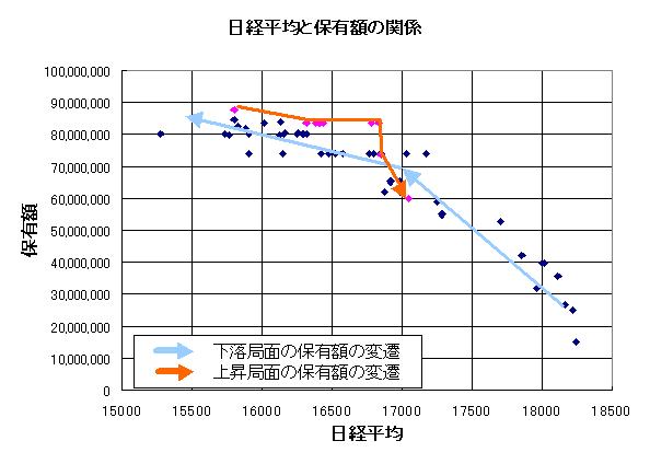 日経平均は17000円台を固める展開になるのでしょうか。サブプライム問題のリスクが低くなりつつあり、もう一つの懸念である円高もこれ以上に進む兆しはなく、対ドルで115円をキープ、対ユーロでも163円と主要輸出企業の想定為替レートから総じて円安に推移しています。夏までの上方修正期待はサブプライム問題で一旦しぼんでしまいましたが、今月後半の企業決算では上方修正をしてくる企業もあるのではないでしょうか。Myポートフォリオは持ち高を修正して決算発表を待ちたいと思います。↓のグラフは日経平均を横軸、保有額を縦軸にして7月中旬の高値から昨日までをプロットしたものです。『下げたら買い、上げたら売り』のルールで、下げ局面で17000円を境に弱気に傾き、買い進めませんでしたが、損切りしなかった事は結果として成功しました。戻り局面では17000円近辺まで我慢し、昨日の売りで持ち高整理は一旦終了という所です。これからも好決算を期待して「下げたら買い、上げたら売りで」で行きます。