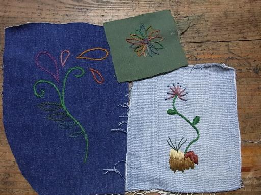 今日も暑かったですね~!そしてもう8月です。流れが速くてびっくりしちゃいます!今日はハギレの刺繍たちを紹介します。作業の合間や、暇な時やっているので、特に意味はなく適当に刺繍した物です。リメイクに使う時もありますが、最近はこんな感じでハギレをバージョンアップさせています