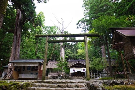 歴史を感じさせる木製の鳥居の向こうに本殿があります。