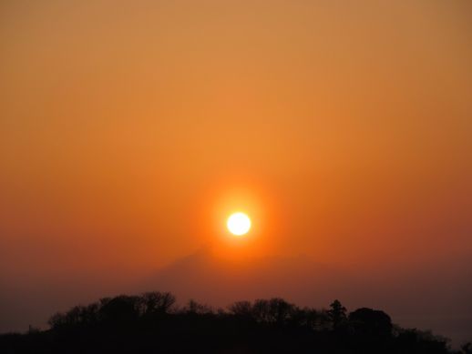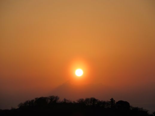 光環とともに、霞の中に消えていく夕日でした。