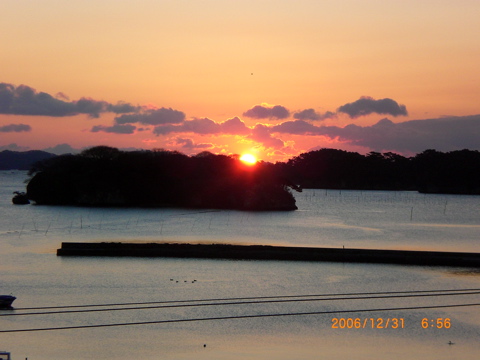 あけましておめでとうございます。年末に松島の海風土というホテルに泊まり、露天風呂につかりながら取った06年最後の朝日です。おかげで年明け早々鼻風邪を引いてしまい、健康の有難さを身を持って感じているところです。 ちょっと体調が悪いだけで、これだけ日々の生活に不自由するのですから、持病をお持ちの方は本当に大変な精神力だと思います。みなさんがこれからも益々健康でいられるように今年もがんばります。