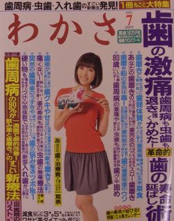 仙台市泉区の歯周内科治療のながさわ歯科医院の長澤です。いつも有り難うございます。皆様の健康に役立つ情報をお届けできたらと思っています 「わかさ」という健康雑誌があるのですが、今発売中の7月号の別冊に掲載されています。 結構な読者数があるのか、発売されてから問い合わせが殺到しております。 他県の方からも問い合わせがあり、当方びっくりしていますが、受診された方からは、永年悩んでいた歯周病が改善して、喜ばれております。 それほど劇的に改善します。感動します。