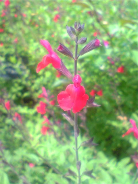 はな:チェリーセージ、モナルダ、チョウセンアザミの1種です。ハーブも花の真っ盛りです。チョウセンアザミは3~4mぐらいになります。どれも香りが匂ってきそうです。