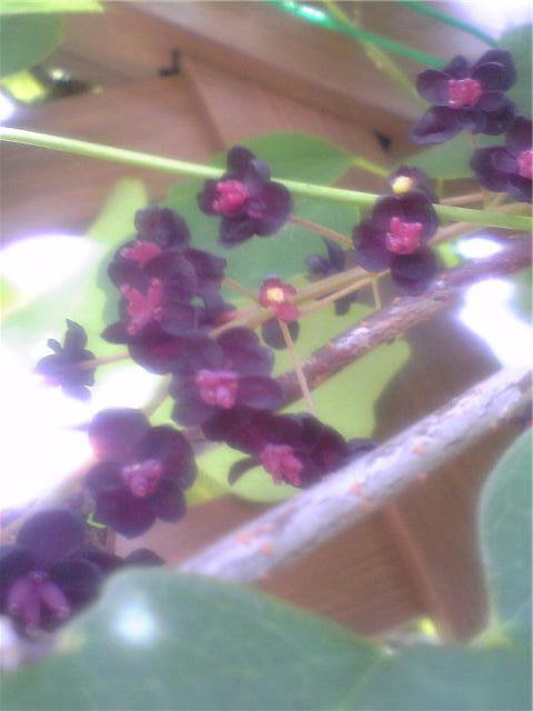 はな、異常気象、春、ミツバアケビ:冷夏で異常気象からか、ミツバアケビが春と秋に咲いています。一方は実がもう大きくなっていますが、花が咲くとは??