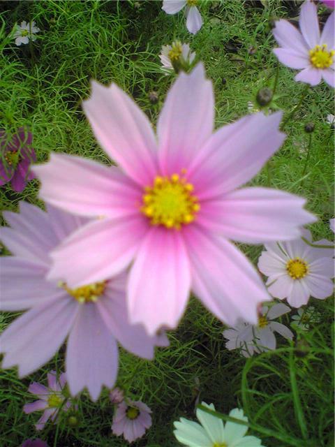 はな、コスモス、ちょう:コスモスもいろんな種類があるようです。蝶も飛んできて蜜を吸っています。