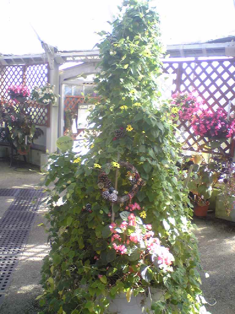 温室の中にもクリスマスツリーが。ツンぺルギアや冬咲きベゴニアです。