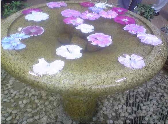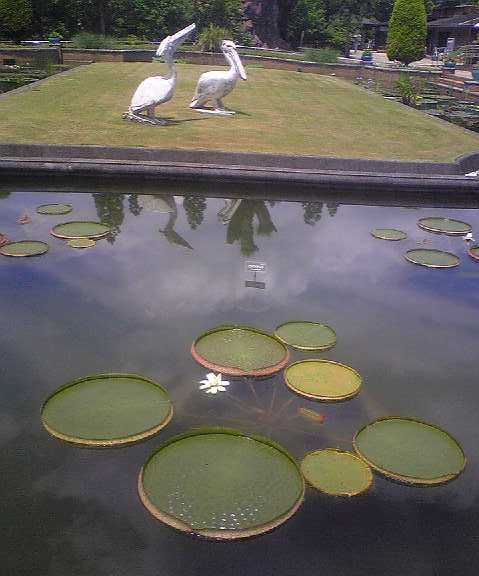 ハスの葉には乗れませんが、オニバスの葉には小さい子は乗れます。ペリカンのオブジェがかわいいです。