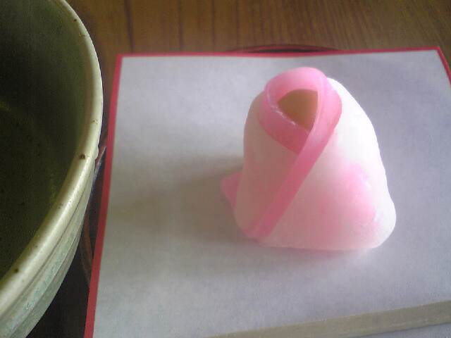 ツバキを見て、お抹茶羽二重餅で黄色の餡を包んでおいしい。金の茶釜の隣にて。