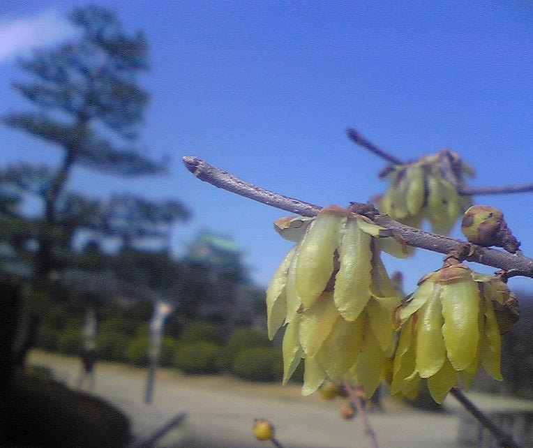 はな、ろうばい、名古屋城天守方向に向けて撮影。ロウバイ(蝋梅、蠟梅、臘梅、唐梅、Chimonanthus praecox)は、ロウバイ科ロウバイ属の落葉低木。1月から2月にかけて黄色い花を付ける落葉広葉低木
