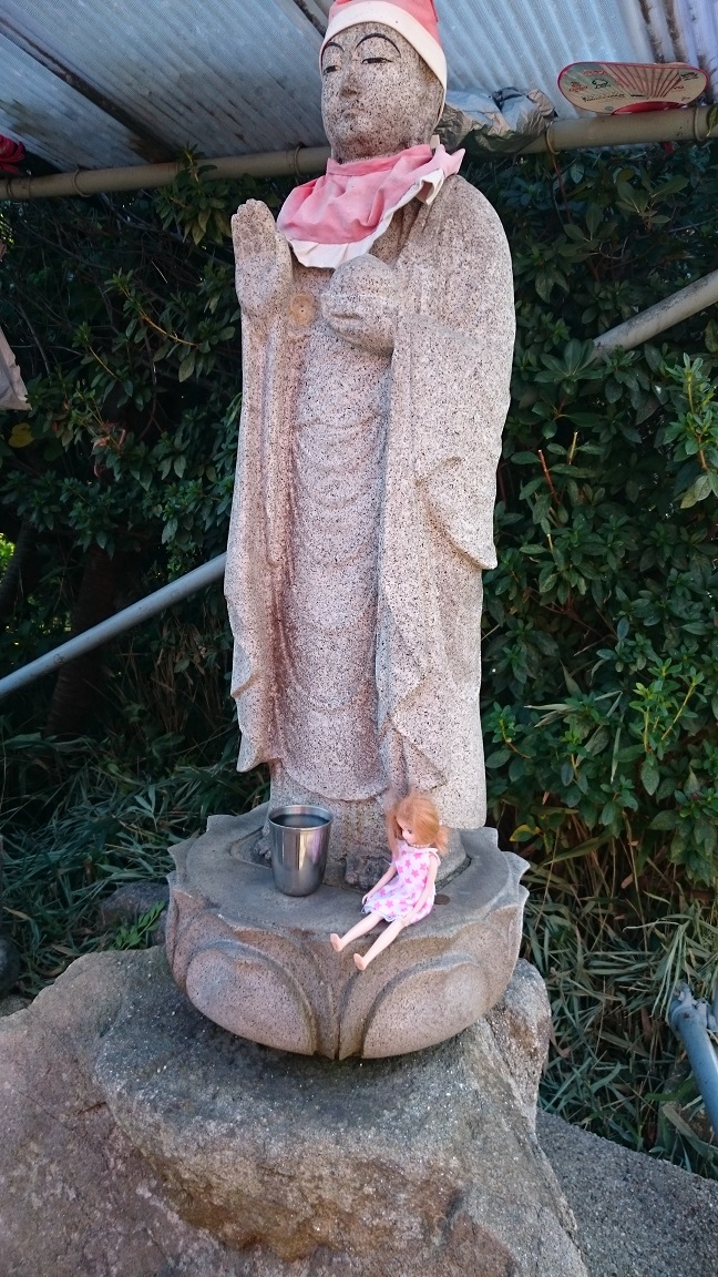 大高緑地にお地蔵さんがあるが、りかちゃんが乗っていた。紅葉を見ているかのよう。ここは草スキーができる。段ボールがあればいい。
