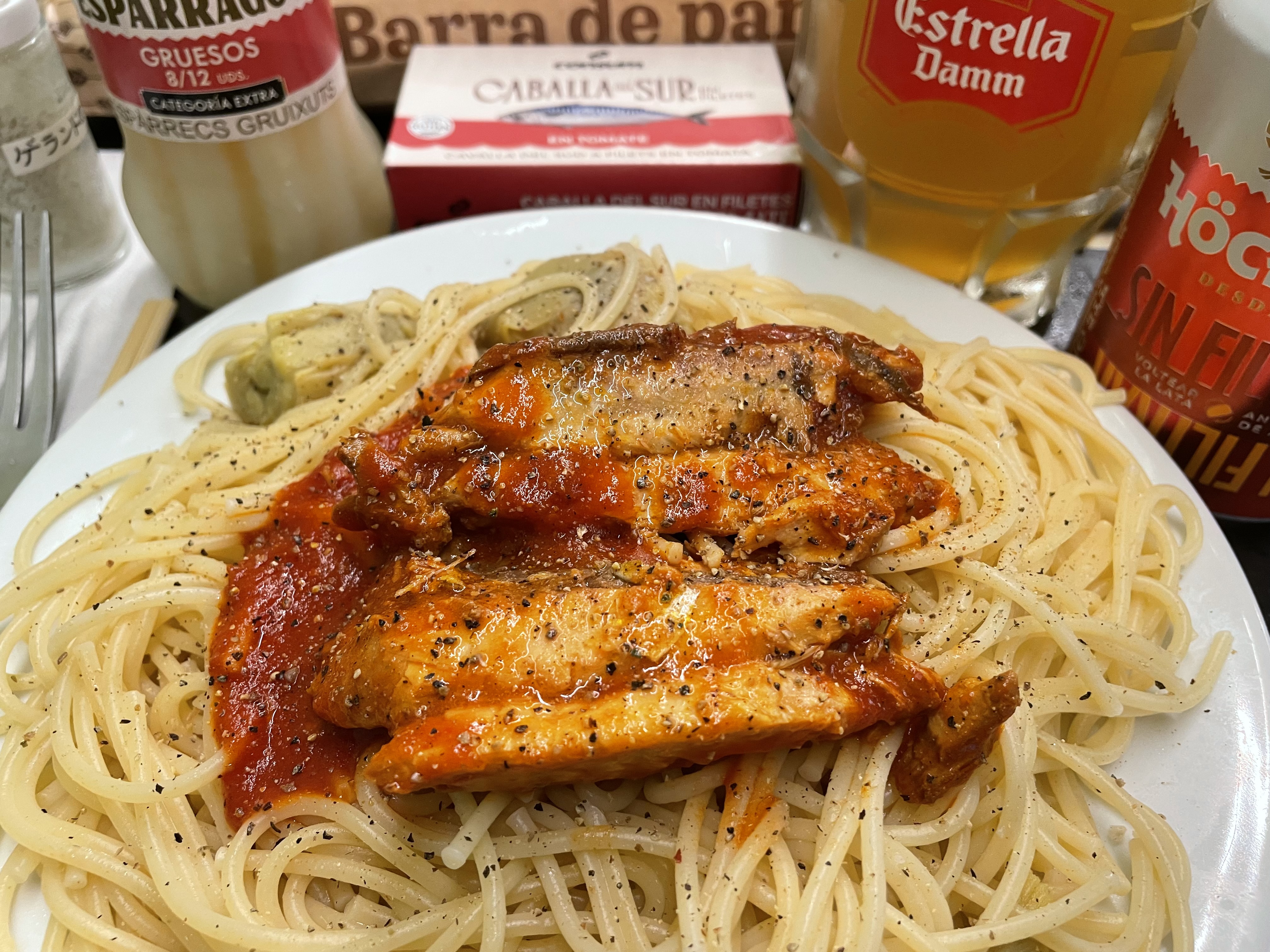 定刻どおり朝8時半にバルセロナ=エル・プラット空港ターミナル2に着いた。入国手続もすぐ終わる。しかしeSIMが使えない。先週の高雄旅でもそうだった。空港からバルセロナ市内行きのバスAerobus に乗る。往復乗車券12.85€(2120円) 。30分ほどで終点のカタルーニャ広場に着く。大通りを北に進みカサバトリョやカサミラを観て歩き本日の宿ザ ロフト ハウス バルセロナに到着した。二段ベッドの相部屋宿いわゆるドミトリーで素泊まり9124円。受付開始の午後3時まで食堂の席で3時間ほど座学。無料Wi-Fiあり。冷蔵庫には無料食材箱があり。缶ビールとパンをいただく。受付後はサグラダファミリアを観てスーパーで今宵の仕込み。調理器具もそろっているのでスパゲッティをつくる。茹でたパスタにトマト煮の鰯缶と持参したゲランドの塩で味付け。これに白アスパラガスと安くて美味しいバゲットで充分な肴となる。ビールと赤ワインがすすむ私の欧州定番部屋食宴だ。