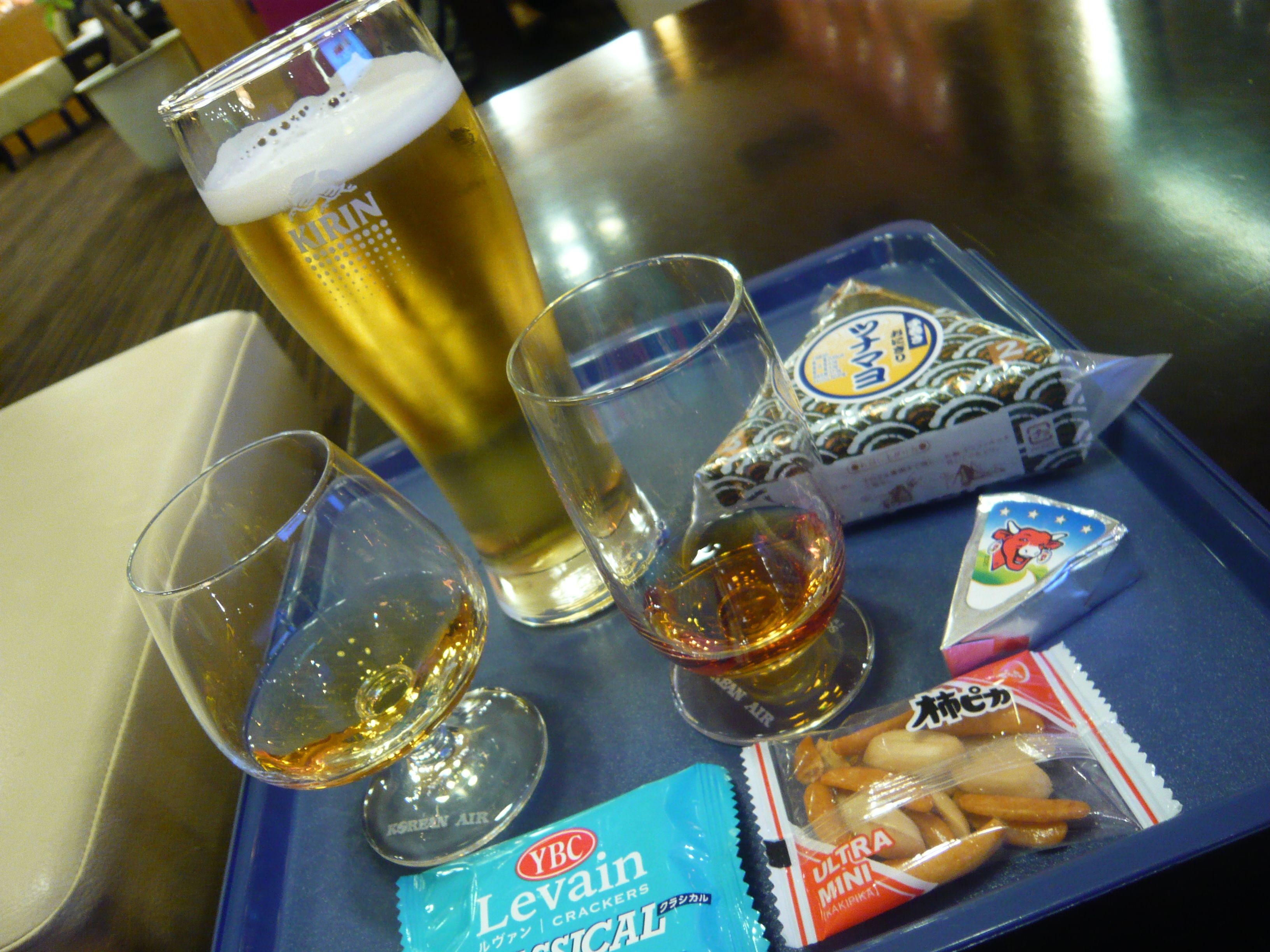 17:00過ぎには3階にある大韓航空のラウンジに入れた。バランタイン17年の後方にレミーマルタンXOがある。おお。5千円のブレンデッドスコッチウイスキーと1万円のブランデーだ。キリン一番搾りの生ビールを注ぎツナマヨおにぎりをあて(つまみ)に普段は決して飲むことのない2つの高級洋酒を交互に味わう。ああ、至福のとき。