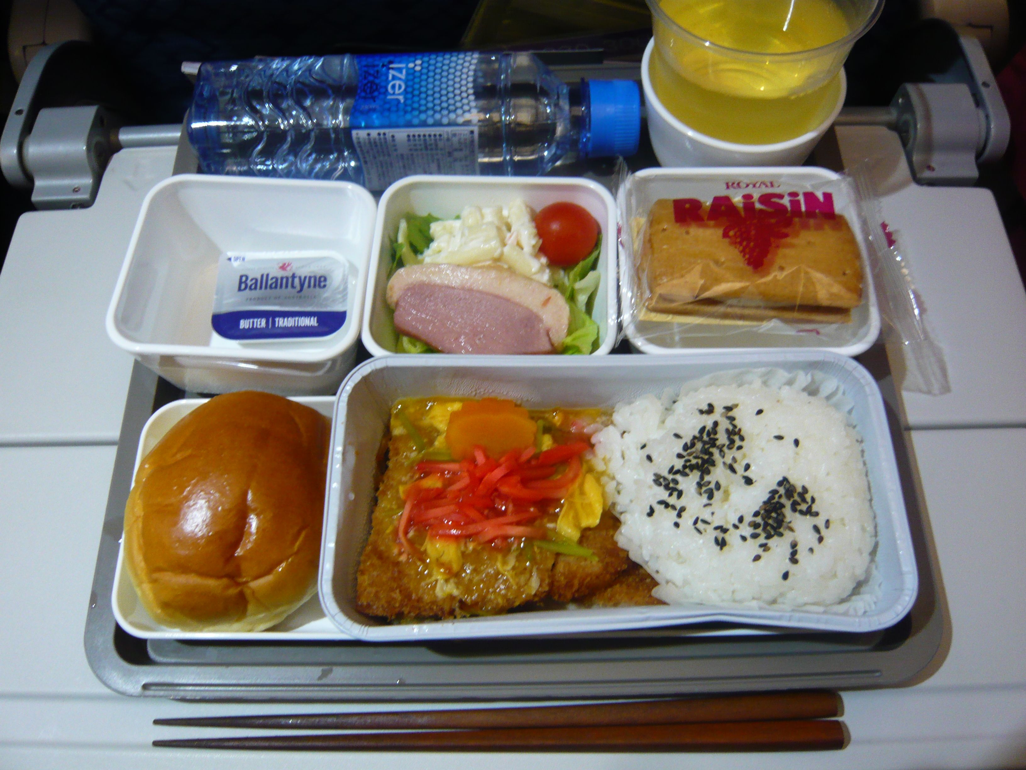 ほろ酔い状態で19:15関空発CX561に乗り込み40G席に着く。アサヒスーパードライの缶ビールとピーナツをいただき、映画『X-MEN: アポカリプス』を観た。ヒュー ジャックマン扮するウルヴァリンも少し出てきて嬉しかった。機内食の夕食カツ丼と鴨ハムサラダで白ワインを飲む。美味しい。文句なし。
