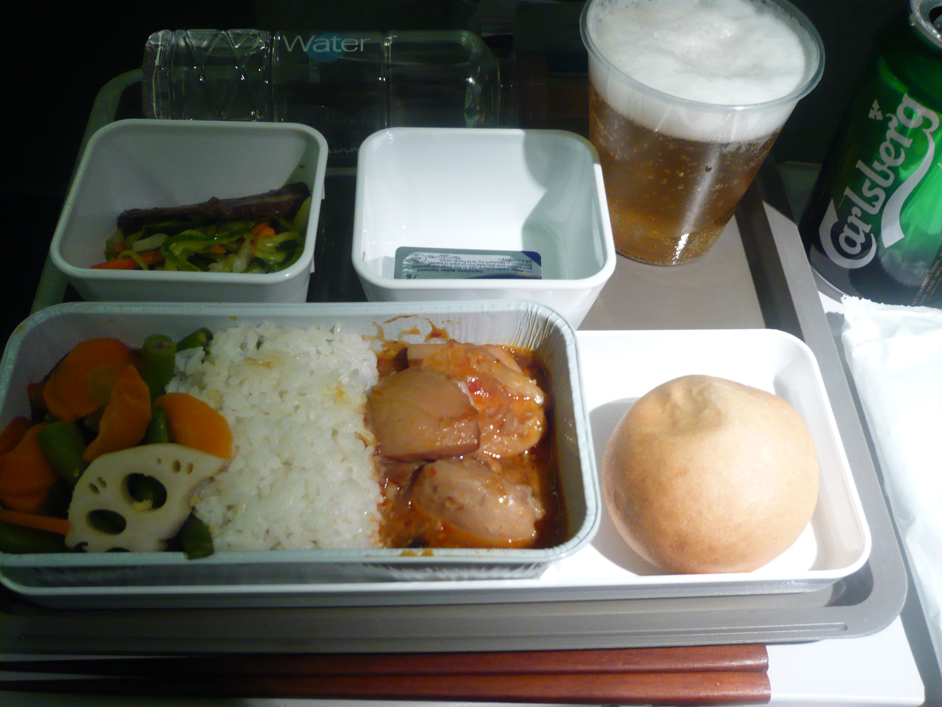 離陸後しばらくしてから機内食が出る。夜中の1時2時くらいだから夜食である。香港行きのCX561便で夕食の機内食をいただき香港国際空港のプラザプレミアムラウンジで香港料理も食べたから満腹だけどいただきました。温野菜と鶏肉ごはん。ビールはカールスバーグ。しかしデザートのハーゲンダッツはもらわなかった。もう入らない。食後ジャズを聞きながらすぐに眠る。けれど数時間後には目覚める。エコノミー席だから熟睡できず仮眠である。映画『インデペンデンス・デイ: リサージェンス』を観る。白ワインを飲み途中で眠る。仮眠。起きて映画『ウォークラフト』それに赤ワインと定番ヌードル。仮眠。朝食は鶏肉お粥チキンコンジンは切れてオムレツとソーセージとジャガイモ。ドイツ料理みたいだがスペイン料理か。