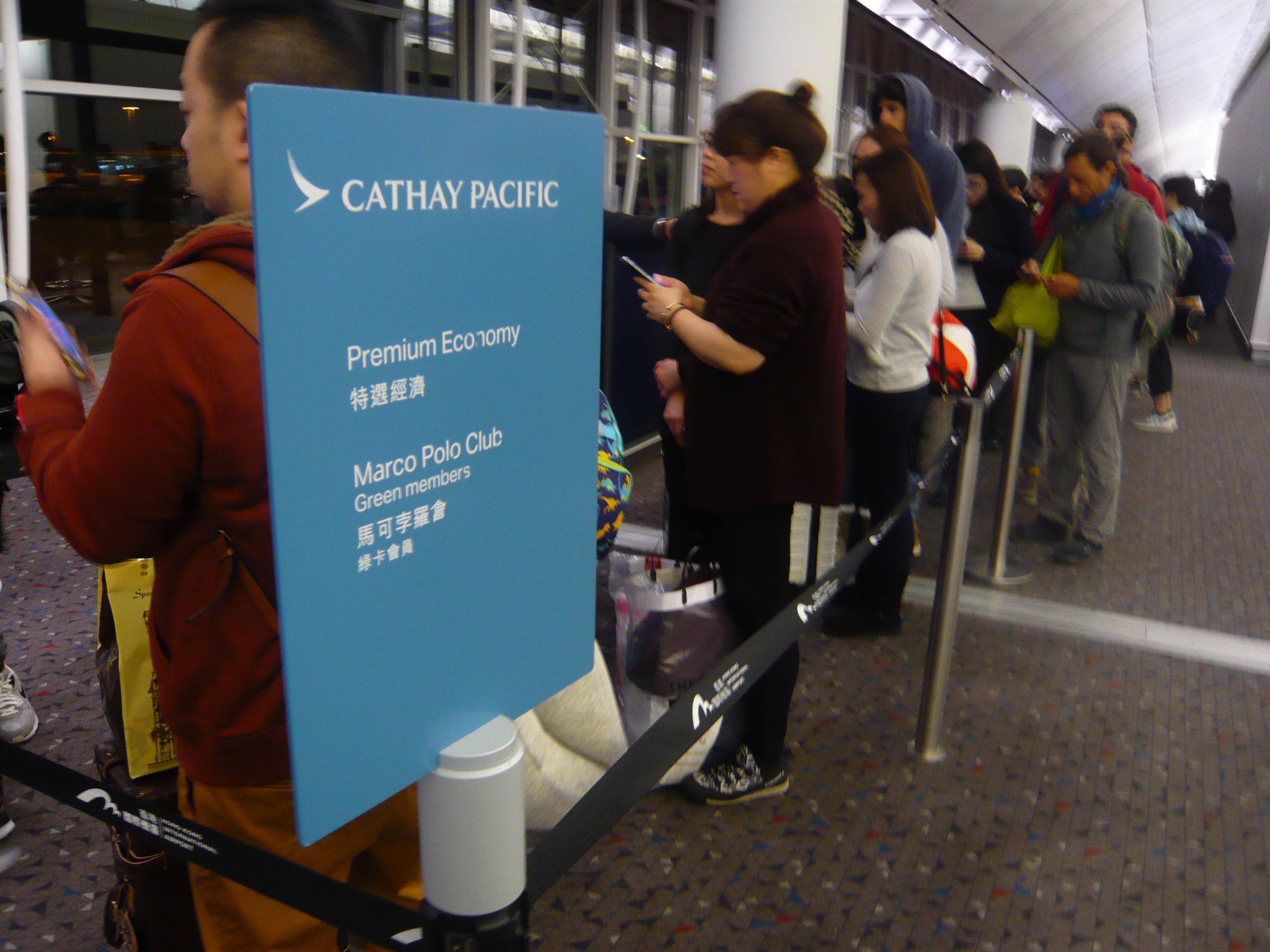 キャセイパシフィック航空315便への搭乗は定刻通り開始。マルコポーロクラブ会員は優先搭乗できる。ただしグリーンメンバーは、ビジネスクラスおよびシルバー・ゴールド・ダイヤモンドメンバーの後、つまり2番目の搭乗となる。それでも早めに搭乗して手荷物を先に棚に収納できて便利であることに今回はじめて気づいた。