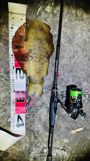 忙しいクリスマスも終わり、年末年始までの合間の休みに行ってきました到着は少し早めの23時前誰もいないのでラッキー♪潮は引き始めているので良さそうだけど風だけで波もほとんどなく生命感が感じられん何事もなく30分程経過。。。(´ε`;)ウーン…ちょっと違うような気がするも、スーパーシャローに変えてゆっくりボトムをとるキャスト時のラインスラッグを取ってからシャクったらンッ!?そのままスプール抑えて即合わせ!22cm 625g 餌木猿スーパーシャロー 定番外の緑赤テープキャストしてからのフリーフォール後の着底で乗ってましたわ 笑この寒い季節は、足がくるんと丸まって可愛い (*´▽`*)それから約1時間シャクってみたがいつも通り何事もなく、眠くなってきたんで終了です。たった一つですが、小さいながらも釣り納めることが出来たんで良かった♪このブログは、忘れっぽくなったおっさんのいつ、どこで(非公開)、どんな状況で何を釣ったかを記録する為の日誌です。SNSでは限界があるのでブログでの記録を継続しています。2023年の釣り初めでは何か釣れると良いな♪では皆さん良いお年を♪