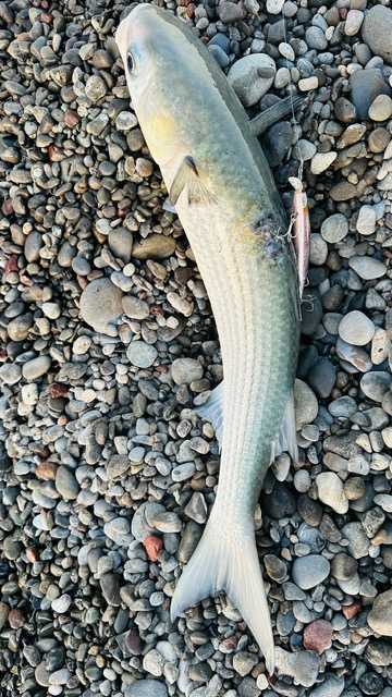 なんかサーフでポツポツ釣れてるみたいなんで行ってみた結果はポツポツどころかウハウハ♪釣り人は広いサーフに20名位いるかな?どこでも誰でも、投げる度に釣れてる感じ♪ジグだとメッキにスマにメジカや等が一投毎に、フックに掛からなくってもまた喰ってくる速攻で飽きたんでトップ縛りでララペン125Fを投げるとこれまたアタックしてくるフッキング率は当然下がるが、目に見える辺りは興奮する!!二度サメに食われそうになったが、間一髪!でも三度目はガッツリかかって、鋭い歯でラインブレイク!!まあ楽しかったんで良しとしよう( ̄▽ ̄)♪因みに殆どリリースしたが、掛かりどころが悪い物は強制持ち帰りとしました