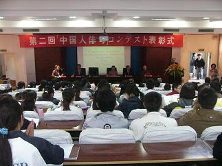 先週の火曜日、我が大学へ日本からの訪問団がやって来た。 はるばるやって来られたのは三重県の『松尾芭蕉俳句記念館』のご一行。 一昨年、その記念館が『中国人俳句コンテスト』を実施したところ、 うちの大学から多数の応募があり、それ以来、去年、今年と交流が続いている。 今回の訪問は、去年のコンテストの表彰式と、学生との交流会の開催が主な目的。 去年のコンテストで優秀賞を獲得した作品は次の通り。 「頭撫で 春風母の 手のごとし」 「出稼ぎに 発つ父母(ちちはは)に 花吹雪」 「クローバー 友と一緒に 摘みしこと」 この大学では3年生から古典の授業が始まる。 古典の文法を勉強することによって、俳句で使う語彙や文法が格段に増える。 上記の優秀作は、それぞれ母親や両親、或いは友達との深い愛を感じさせてくれる。 最優秀賞に選ばれたのは、彼のこの作品。 「泥運び どんどん造る 燕の巣」 素朴な中に生命の躍動感と自然の輝きが感じられる作品。 彼自身はこの作品より、他の応募作品のほうに自信があったようだが、 ともあれ、全中国で第2位の評価を得た。 他にも佳作に選ばれた学生はこんなにたくさんいる。 その後、学生側からは、歓迎の歌の披露(四季の歌)があり、 最後に、俳句訪中団の皆さんと学生たちの交流会へと移っていった。 この会には2年生もたくさん出席していたが、 その2年生たちは、まだ「俳句」について何も知らない。 それでも上級生を見ているうちに、大いに興味をそそられたらしく、 この頃、「先生、俳句を教えてください」というリクエストが多くなった。 というわけで、来週の「作文」の授業は『俳句』について教えることにした。 まずは、堅苦しいことは抜きにして、五七五による言葉遊びから始め、 賑やかな雰囲気の中で、学生同士で創作しあいながら、 俳句に対する興味を深めるような授業にしようと思っている。 「中国人俳句コンテスト」で、この大学からの応募が多いことから、 今回は、『松尾芭蕉俳句記念館』と我が校との友好提携も調印された。 この大学が、中国で最も俳句の創作が盛んな学校になるのも夢ではないかもしれない。