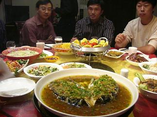 水曜日から金曜日まで、我が大学は運動会。 週末の土日を合わせて、5日間は授業がない。 この機会を利用して、河南省の濮陽に行ってきた。 以前から、濮陽出身の学生に「私の家に来てください」と、何度も誘われていたからだ。 濮陽は、プレステで『三国志』をやったことがある人にはお馴染みの街。 歴史的には、三国志の呂布が死んだところとして有名。 濮陽で何をしていたかといえば、「食べる」、「飲む」。 そして、学生の家族やお父さんの同僚、その友達の皆さんたちと 「話す」「笑う」「握手をする」「肩を抱く」「教育問題について話す」……など。 つまり、小さな日中友好促進をやっていた。 朝、大学を出発して、濮陽に着いたのが昼前。 着くと同時に、挨拶もそこそこに、豪華なレストランに連れて行かれて、早速、昼ごはん。 手前は魚料理で、頭はまず主賓の方へ向けるというのが魚料理のルール。 まず主賓が魚を食べ、その後でなければ他の人は食べることができない。 その後も出るわ、出るわ、次から次へと料理が出てきた。 出てきた料理を食べた後には、更に、麺の実演。 麺を食べた後には、こんなものまで。 亀! そして、最後は記念写真。 日本人教師を家に招くということは、我々が考えている以上に、 学生や家族にとっては光栄なことのようだ。 私が家に来ると聞いて、学生の両親は方々に連絡を取り、 同僚や友人を集めての、このような盛大な食事会を催してくれた。 しかも、初日の昼ごはんだけでなく、夜ごはん、二日目の昼ごはん、と3回も。 こちらは二日目の昼ごはん。 これまで学生の家は何軒か訪ねた。 その回数は両手では足りないくらいになった。 そして、いつもいつも、言葉では言い表せないくらいの歓迎を受けた。 一緒に酒を飲み、料理に舌鼓を打ちながら、冗談を言い、真面目な話もする。 会う人、会う人、誰もが底抜けに親切で、日本人に対する好意を表してくれる。 そして、私が帰った後で、日本人に対するイメージがもっと良くなっていれば、 私が中国で仕事をしている意味があるというものだ。