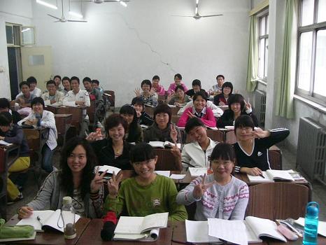 昨日から1年生の授業が始まった。 入学式を終えた後は、ずっと軍事教練をやっていたのだが、 国慶節が明けた昨日から、いよいよ大学での授業が始まった。 私は今年も1年生を担当する。 1年生たちは、日本語は、まだ「あいうえお」さえわからない。 ほとんどの学生が、日本人に会うことさえ、初めてだ。 だから、初めての授業はいつも以上に緊張する。 初めての授業で「日本語は面白い」「授業が楽しい」「この先生は良さそうだ」 という感じを抱かせることができれば、 学生たちは日本語の勉強に興味を持ち、自分で自発的に勉強を始めるからだ。 日本語初心者の学生たちにとっては、まさに「一年の計は初授業にあり」。 だから昨日は、まず賑やかで、笑いが絶えず、緊張感を払拭するような授業を心掛けた。 外国語をマスターするためには、たくさん話した方が良い。 そのためには話しやすい雰囲気を作ることから始めなければならない。 結果として、爆笑や拍手が絶えない、活発な授業になった。 隣の教室で4年生(去年の私の学生たち)が授業をしていたが、 その教室まで、私のクラスの賑やかさが届いていたという。 私の授業には2年生や4年生たち、去年教えた学生たちが見学に来てくれた。 授業ちゅう、彼女らは、教室の後ろに座って、 笑ったり、頷いたりしながら、親指を立てた手を上げて、 「先生、グー!」「いいよ!」 などと賞賛の合図を送ってくれた。 そういうことも、私の励みになり、自信につながっていく。 また1年、新しい1年生たちと、うまくやれそうだ。